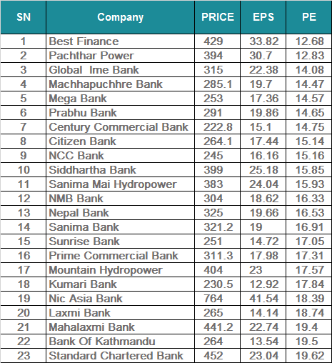 शेयर बजारमा प्रयोग हुने विभिन्न सूचकहरुमध्ये पिई रेशियो पनि एक महत्वपुर्ण सूचक हो जसले कुनै पनि कम्पनीको शेयरमा लगानी गर्न कति जोखिम लिनुपर्छ भन्ने देखाउछ। बिहीबारसम्मको तथ्याँकलाई आधार मान्दा सूचीकृत कम्पनीहरुमध्ये ७ वटा कम्पनीको मूल्य आम्दानी अनुपात १५ गुणाभन्दा कम रहेको छ भने २० गुणाभन्दा कम पिई रेशियो हुने २३ वटा कम्पनी छन्। सूचीकृत कम्पनीहरुमा बेष्ट फाइनान्सको पिई रेशियो सबैभन्दा कम १२ गुणा मात्रै रहेको देखिएको छ। यस्तै पाँचथर पावरको पनि पिई रेशियो १२.८३ गुणा मात्रै रहेको छ।