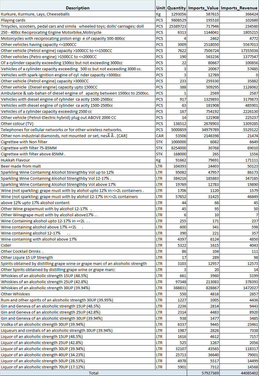 चालु आर्थिक वर्षको १० महिनामा यी १० बस्तुहरु ५७अर्ब ९२ करोड ७३ लाख रुपैयाँको आयात भएको भन्सार विभागको तथ्याँकले देखाउछ। यो भनेको मासिक ६ अर्ब ४३ करोड रुपैयाँ हो। सरकारले यी १० बस्तुको आयात रोक्दा मासिक ६ अर्ब रुपैयाँभन्दा धेरैको आयात घट्नेछ। यस अवधिमा ५८ करोड ७६ लाख रुपैयाँको कुरकुरे, कुरमुरे, लेज र चिजबल आयात भएको छ। यस्तै १९ करोड ५५ लाख रुपैयाँको खेल्ने तास आयात भएको विभागको तथ्याँकले देखाउँछ। यसैगरी ७१ करोड ७९ लाख रुपैयाँको खेलौना आयात भएको छ। भने १ अर्ब १४ करोड ६५ लाख रुपैयाँको मोटरसाइकल आयात भएको छ।