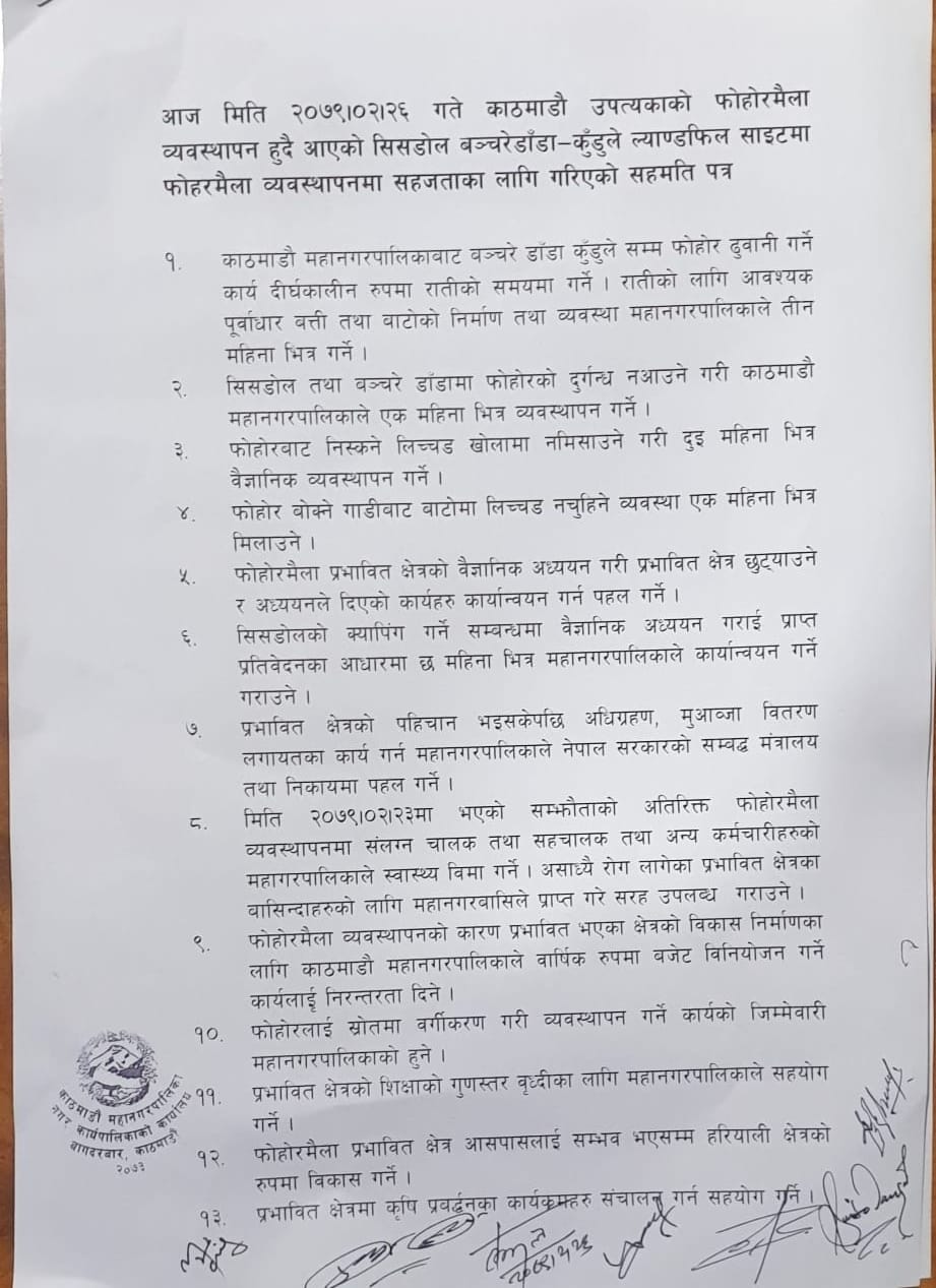 फोहोरमैला प्रभावित क्षेत्रको वैज्ञानिक अध्ययन गरी प्रभावित क्षेत्र छुट्याउने र अध्ययनले दिएको कार्यहरु कार्यान्वयन गर्न पहल गर्ने पनि सहमति भएको छ । फोहोरमैला व्यवस्थापनको कारण प्रभावित भएका क्षेत्रको विकास निर्माणका लागि काठमाडौ महानगरपालिकाले वार्षिक रुपमा बजेट विनियोजन गर्ने, फोहोरलाई स्रोतमा वर्गीकरण गरी व्यवस्थापन गर्ने कार्यको जिम्मेवारी महानगरपालिकाको हुने, प्रभावित क्षेत्रको शिक्षाको गुणस्तर वृद्धिका लागि महानगरपालिकाले सहयोग गर्ने लगायत विषय सहमतिपत्रमा उल्लेख गरिएको छ। सेतोपाटी ।