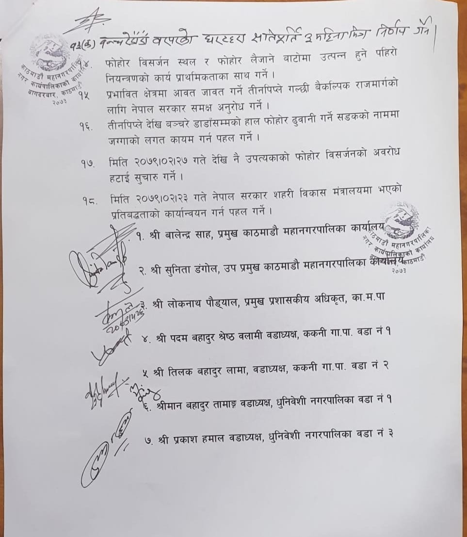 काठमाडौं । काठमाडौँ उपत्यकाको फोहोर अबदेखि राति मात्र व्यवस्थापन गर्न लैजाने गरी काठमाडौं महानगरपालिका र स्थानीय वडाध्यक्षहरूबीच बिहीबार राति १८ बुँदे सहमति भएको छ।सहमतिपत्रमा काठमाडौं महानगरपालिकाका प्रमुख बालेन्द्र शाह, उपप्रमुख सुनिता डंगोल, प्रमुख प्रशासकीय अधिकृत लोकनाथ पौड्याल, ककनी गाउँपालिका- १ का अध्यक्ष पदमबहादुर श्रेष्ठ बलामी, ककनी गाउँपालिका- २ का अध्यक्ष तिलकबहादुर लामा, धुनीबेंसी नगरपालिका- १ अध्यक्ष बहादुर तामाङ र धुनीबेंसी नगरपालिका- ३ का अध्यक्ष प्रकाश हमालले हस्ताक्षर गरेका छन् ।
