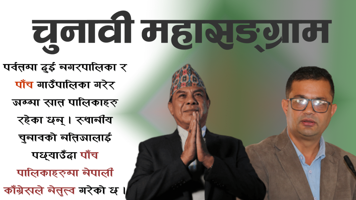 पर्वतमा दुई नगरपालिका र पाँच गाउँपालिका गरेर जम्मा सात पालिकाहरू रहेका छन् । स्थानीय चुनावको नतिजालाई पछ्याउँदा पाँच पालिकाहरूमा नेपाली काँग्रेसले नेतृत्व गरेको छ । काँग्रेसले जिल्लाको दुई वटै नगरपालिका कुश्मा र फलेवास जितेको थियो भने तीन गाउँपालिका जलजला, बिहादी र पैयूँमा पनि काँग्रेसले नै जितेको थियो । काँग्रेसले जितेका पालिका प्रमुख र पराजित दुई पालिका मोदी र महाशिला गाउँपालिकाको मत सङ्ख्या समेत जोड्दा गठबन्धन दलले पाएको जम्मा मत ३७ हजार ४ सय ८५ हो ।