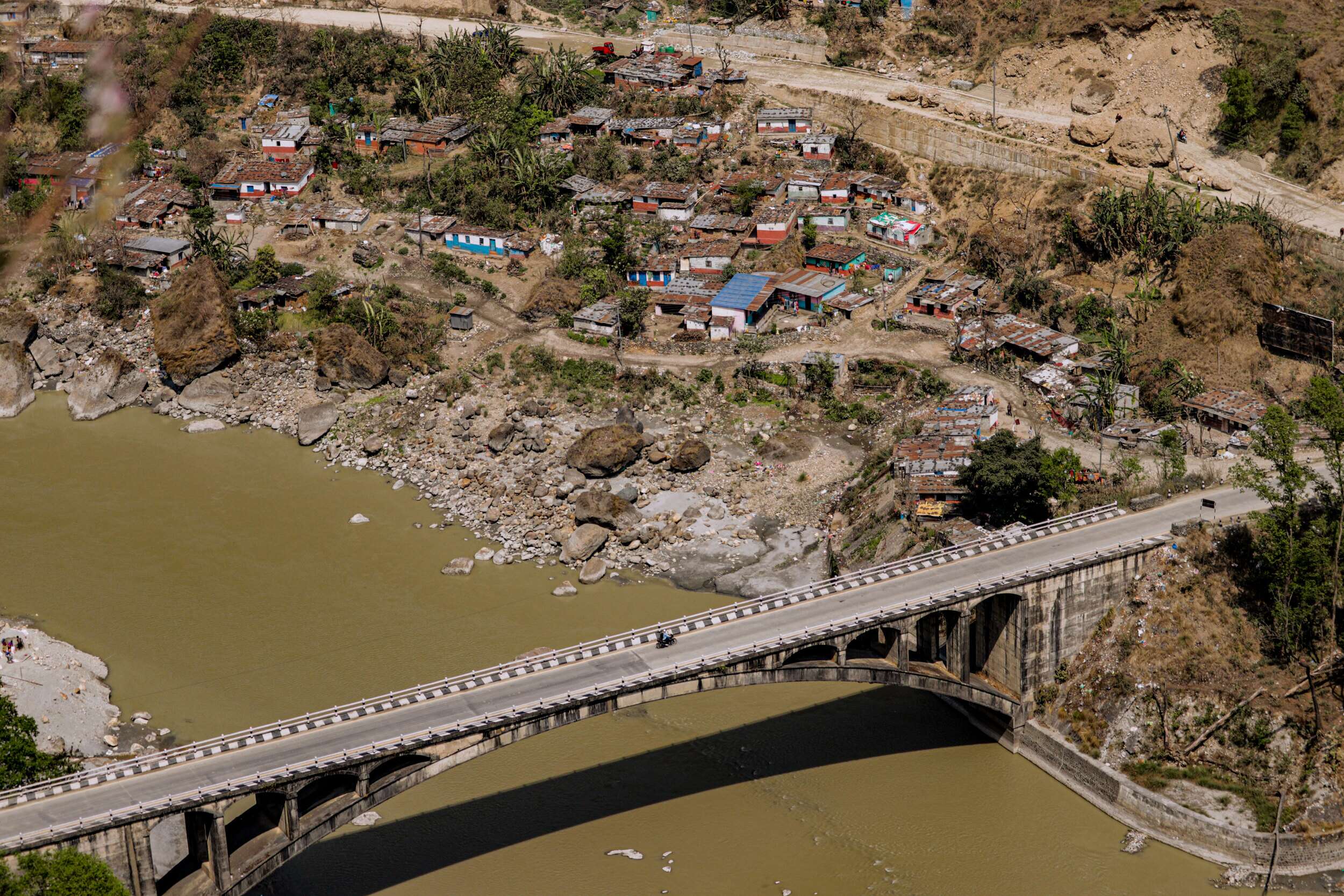 पर्वत र बागलुङ जोड्ने कालीगण्डकी नदीमाथि निर्मित मालढुङ्गाको माटरेबल पुलसँगै नदी छेउमा रहेको माझी बस्ती र बस्ती माथि देखिएको म्याग्दी, मुस्ताङ पुग्ने कच्ची सडक ।