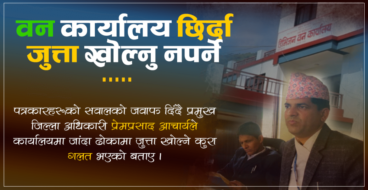 पत्रकारहरूको सवालको जवाफ दिँदै प्रमुख जिल्ला अधिकारी प्रेम प्रसाद आचार्यले कार्यालयमा जाँदा ढोकामा जुत्ता खोल्ने कुरा गलत भएको बताए । “हामीले हप्ता दिन अघि नै वन कार्यालयलाई रोक्न भनिसकेका छौँ ।” उनले भने, “सेवाग्राहीलाई ढोकामा जुत्ता चप्पल खोल्न लगाउने काम गलत हो ।”
