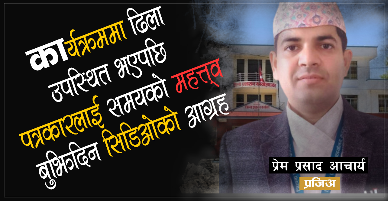 प्रमुख जिल्ला अधिकारी आचार्यले पत्रकारहरूलाई आगामी दिनमा कुनै पनि सार्वजनिक कार्यक्रमहरूमा निर्धारित समयमा नै उपस्थित हुन गरेको अनुरोध सह्रानीय भएको पत्रकारहरूको भनाई छ ।